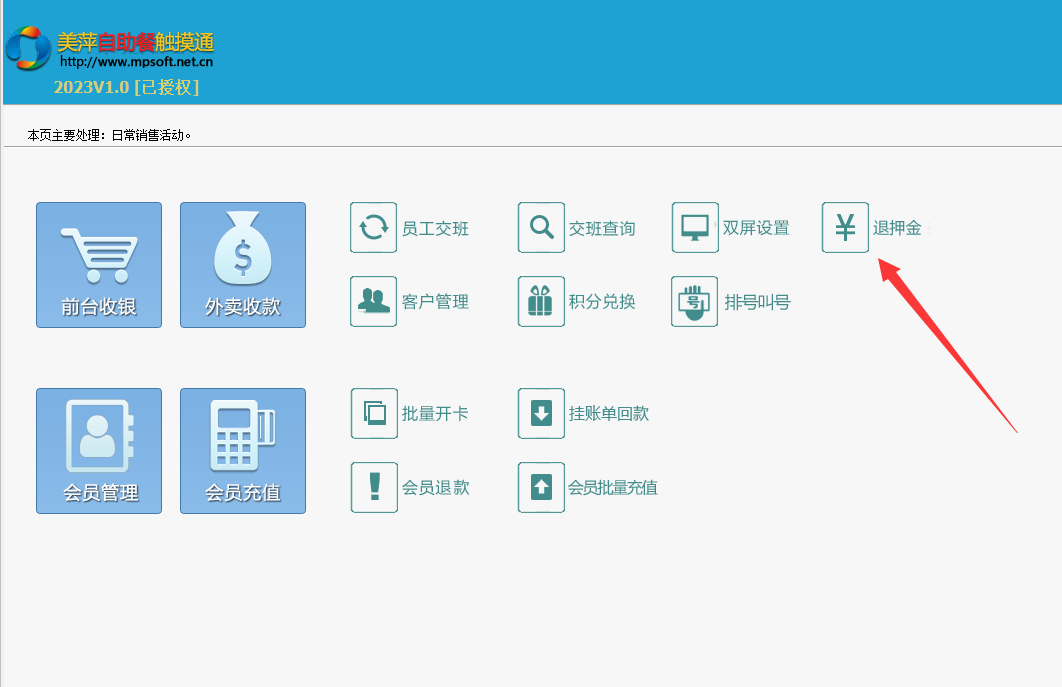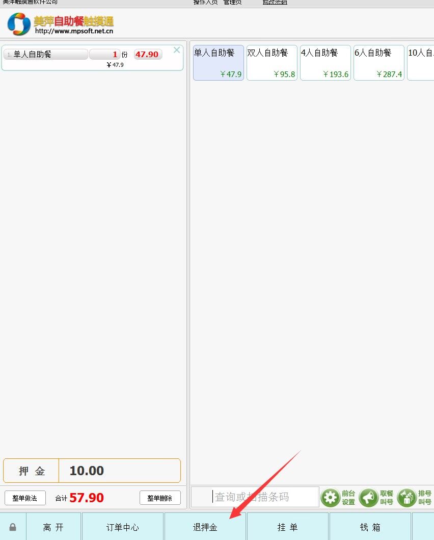 美萍旺店自助餐管理软件中,退押金在那里?在外面,有大图标,如图示